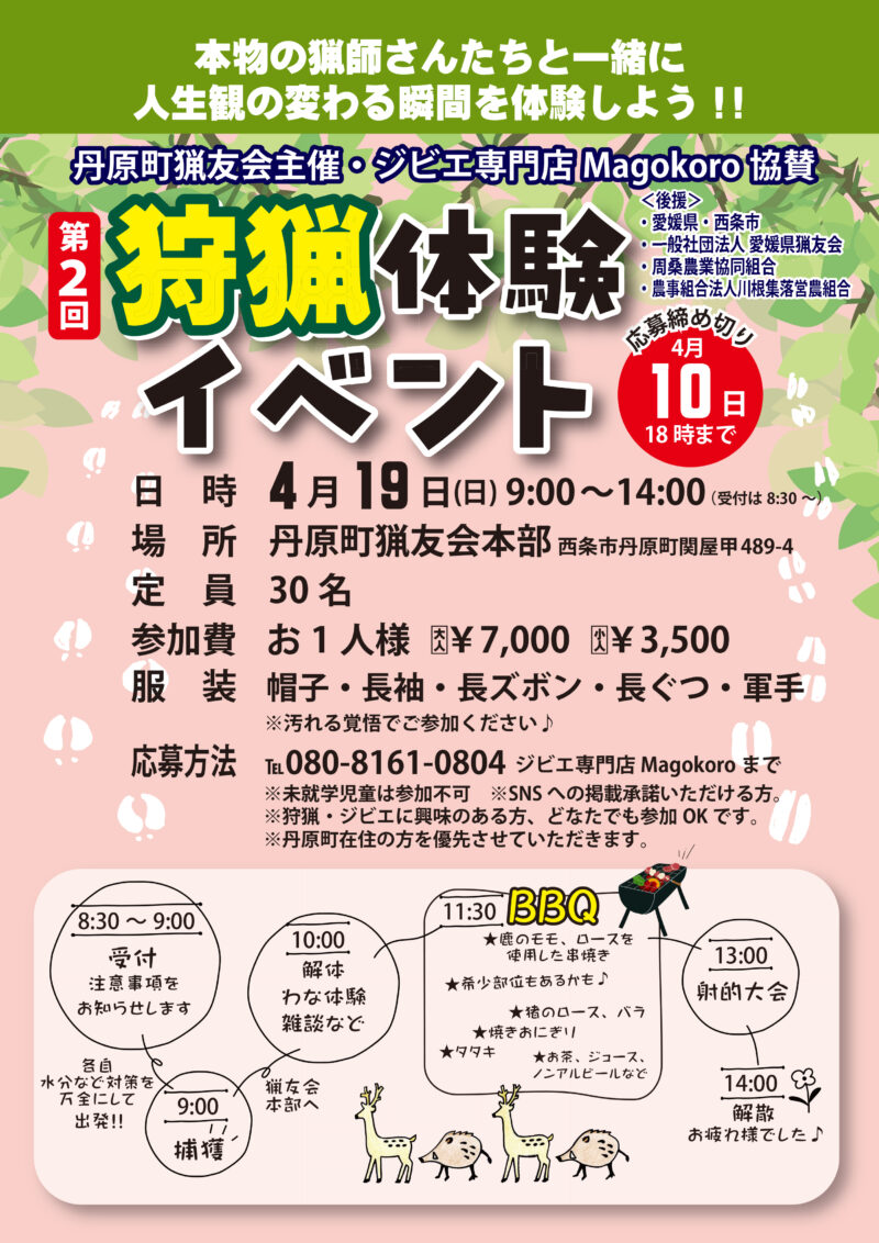 丹原町猟友会主催、そして美味しいジビエでお馴染みの専門店『Magokoro』協賛という、ジビエファンにはたまらないこのイベント。「本物の猟師さんたちと一緒に人生観の変わる瞬間を体験しよう!!」というキャッチコピーの通り、普段は絶対に味わえない濃密な1日が待っています。