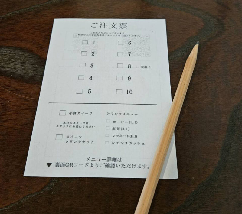 一歩足を踏み入れると、そこには丁寧な暮らしが息づく和の空間が広がっていました。 畳の香りや木の温もり、控えめに生けられた枝もの。 お座敷とテーブル席があり、初めての方でも「ただいま」と言いたくなるような、穏やかな空気が流れています。 注文は、鉛筆で注文票にチェックを入れるスタイル。 このひと手間が、自分の食事を大切に選んでいる実感を与えてくれますね。