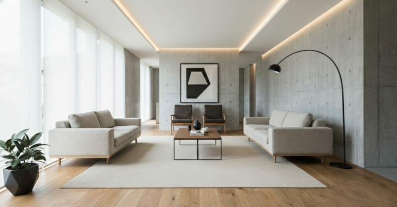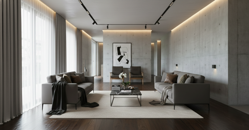 - デザインの意図: ダークトーンのフローリングに、重厚感のあるグレーのソファを対面配置。コンクリートの質感に、温かみのある間接照明が柔らかな陰影を落とし、空間に奥行きと品格を与えます。