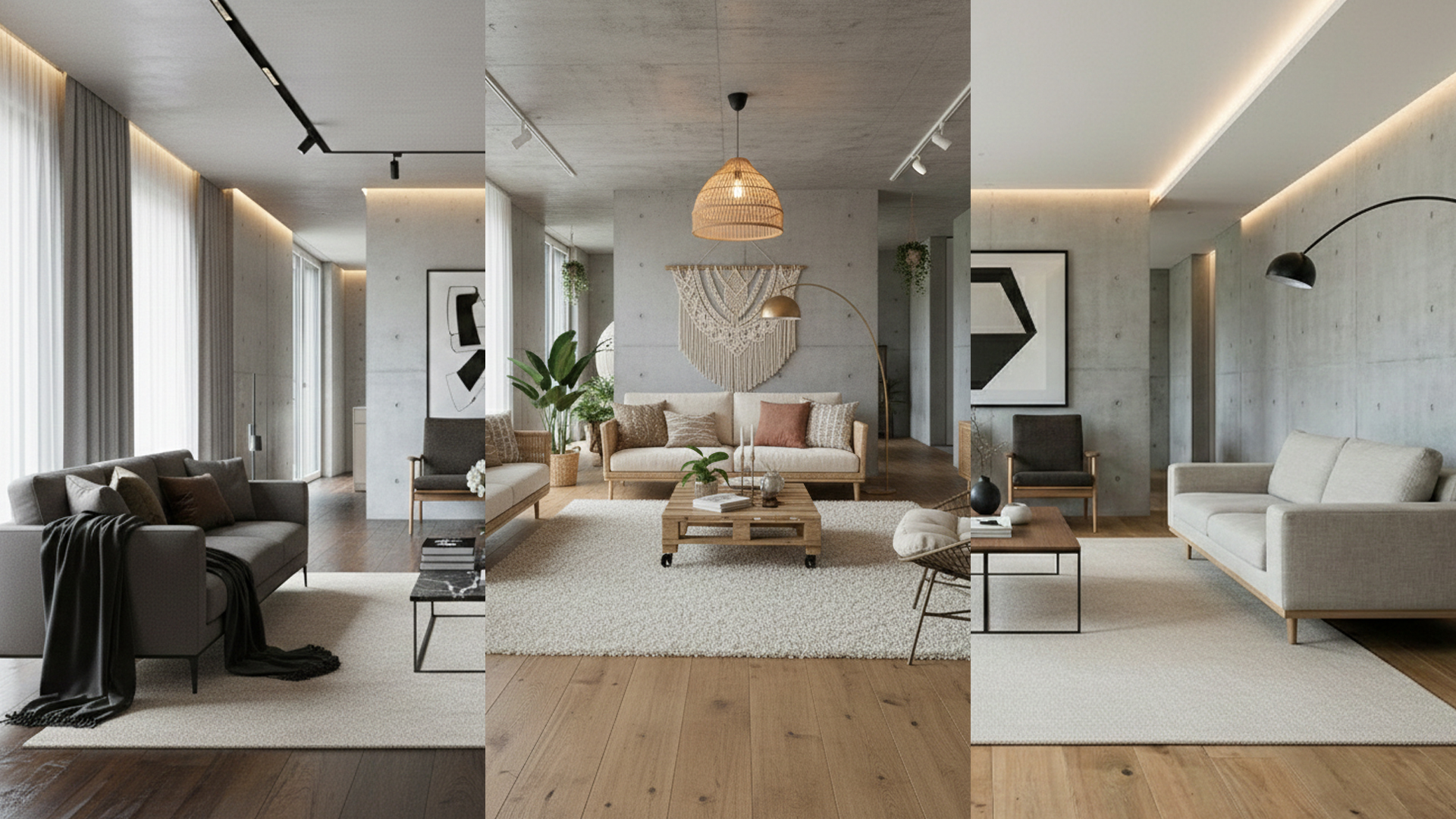 無機質で力強いコンクリート打放しの空間。そのポテンシャルを最大限に引き出し、全く異なる3つの表情を持つ居住空間へと昇華させました。あなたなら、どのスタイルで新しい生活を始めますか。
