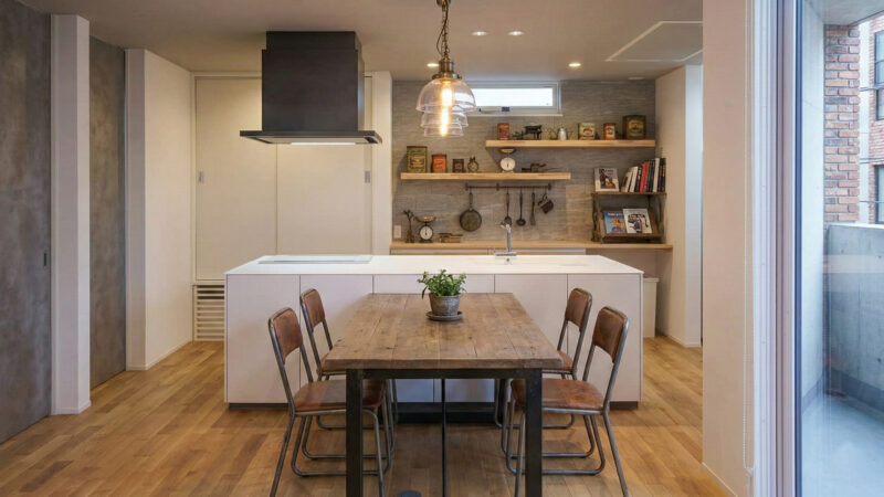 無骨な素材が織りなす、大人の隠れ家。 マットブラックの金属、古材の渋い茶、そしてレザーの深い質感。都市の風景を切り取ったような、無骨でドラマチックな色の組み合わせは、強い個性を生み出します。