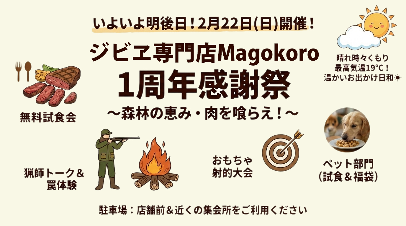 皆様、こんにちは!ジビエ専門店Magokoroです。 いよいよ明後日、2月22日(日)は、当店の大イベント! 『ジビエ専門店Magokoro 1周年感謝祭 ~森林の恵み・肉を喰らえ!』 の開催日です✨ 気になる22日の西
