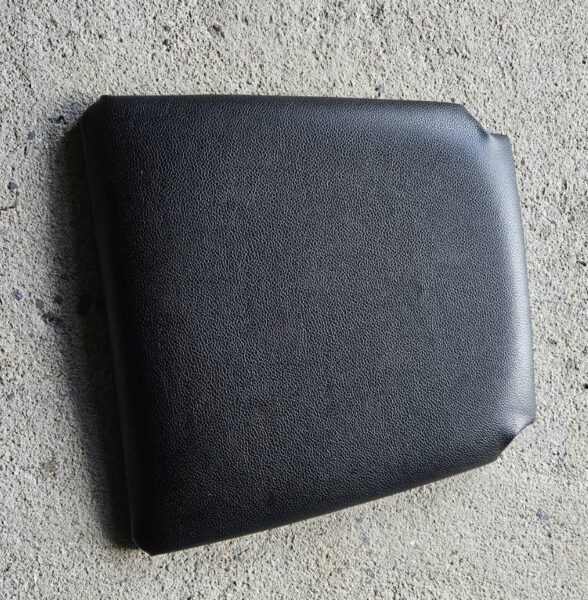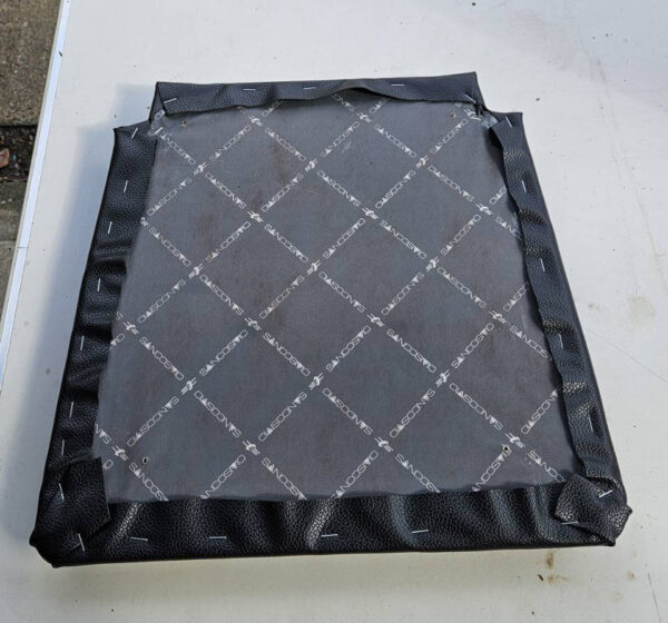 まずは古い座面を取り外し、新しい生地で張り替えていきます。今回選んだのは、シックで高級感があり、汚れにも強い黒の合皮レザーです。